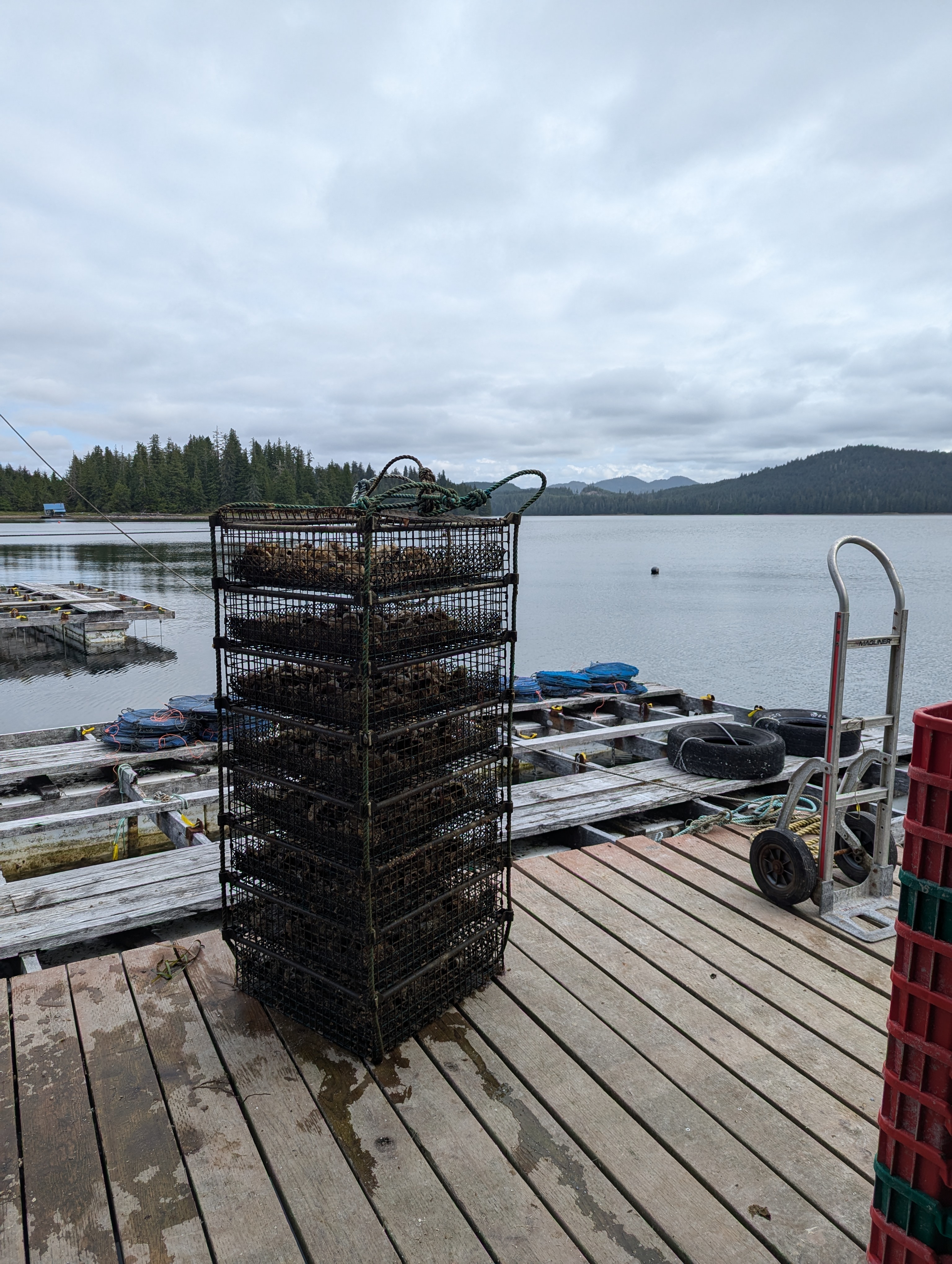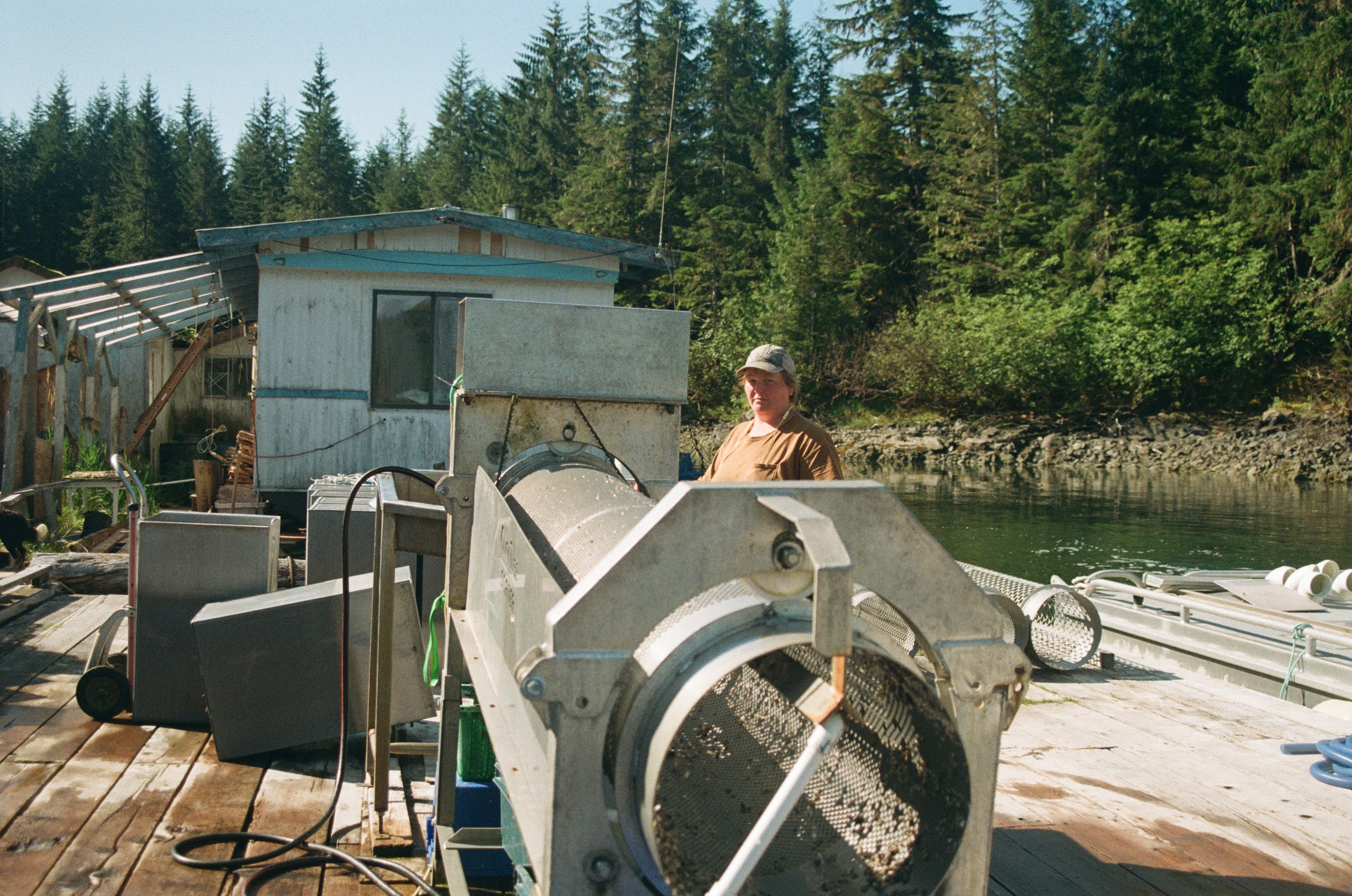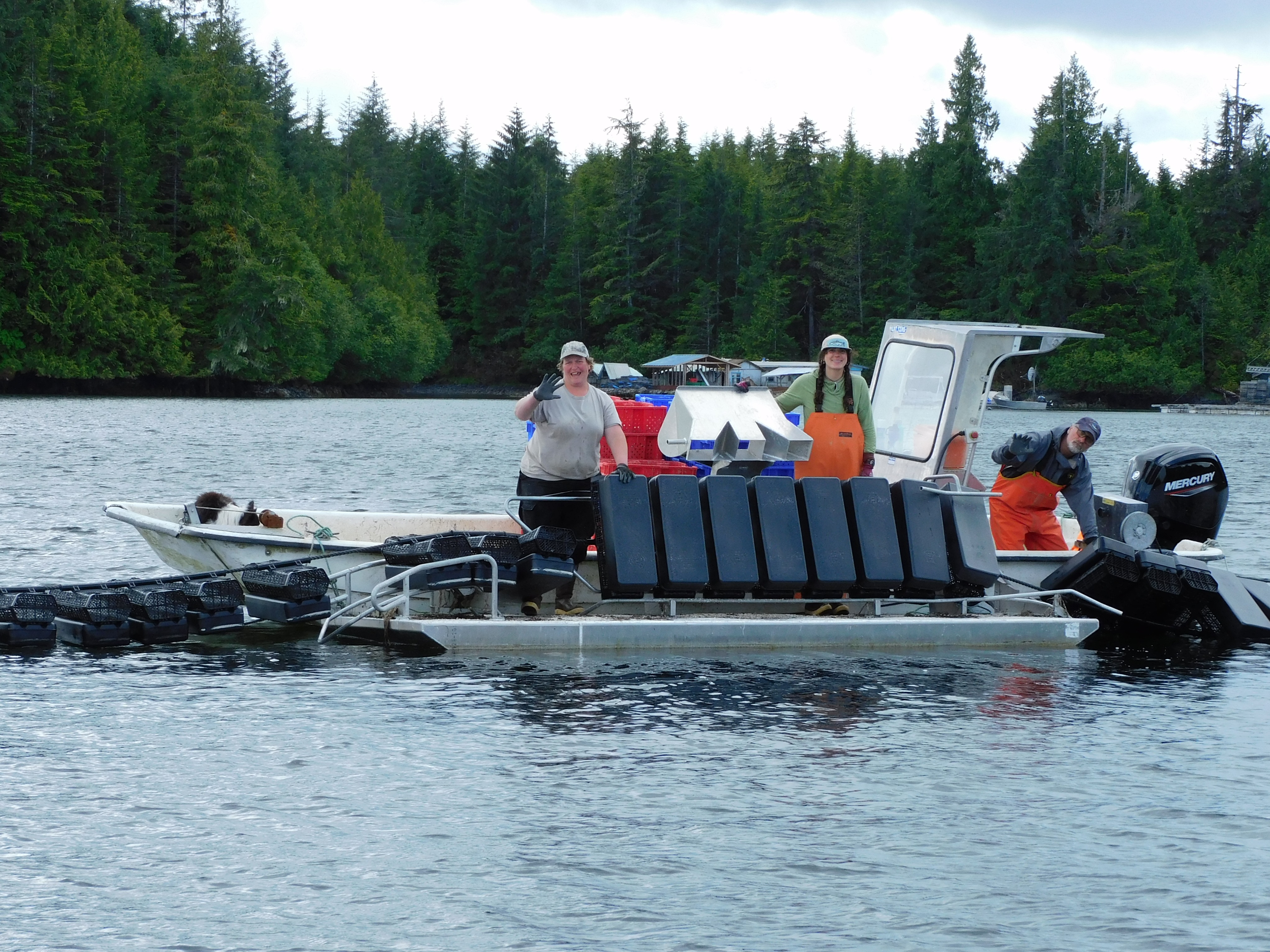 At Blue Starr Oyster Co., our oysters are farmed with a variety of techniques and gear. From the hatchery, we source small individual oysters, called “seed”, that are about 3 mm across and grow them in an intensive system called a FLUPSY. This paddlewheel-powered nursery system floats on the surface of the sea and allows us to intensively cultivate 3-5 million “baby” oysters with constant care and attention. When the seed reaches about 16 mm (5/8″) across we sell most of it to oyster farmers throughout Alaska. However, we keep a fair amount to growout ourselves.