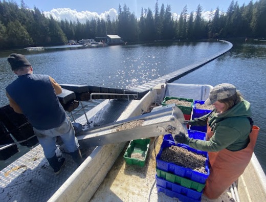 This larger seed goes from the nursery into the main farm. The “big babies” are grown in surface floating gear that allows access to warmer, richer conditions at the top of the water column. Blue Starr utilizes the new Flip Farm (New Zealand) system that continues to develop a deep-cupped, well-formed oyster. Flip Farm uses heavy-duty plastic baskets with attached floats that allow for the “tide to go out” by flipping the baskets on top of the floats. This process mimics natural conditions that clean the shell and strengthen the adductor muscle. A stronger, compact shell leads to a longer shelf life AND easier shucking!